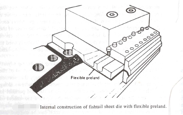 A curved manifold will result in a curved pre-land barrier. Choosing the proper curve, and perhaps including taper at the same time, can enable a closer match between the pressure drop and the melt rheology. Sheet dies with curved and tapered manifolds are called “fishtail” dies because of the resemblance of the manifold to a fishtail shape. Another of the references at the end of this chapter describes the finite element flow analysis used to determine the shape of the manifold, and the size and shape of the pre-land area as applied to a specific extrusion material.